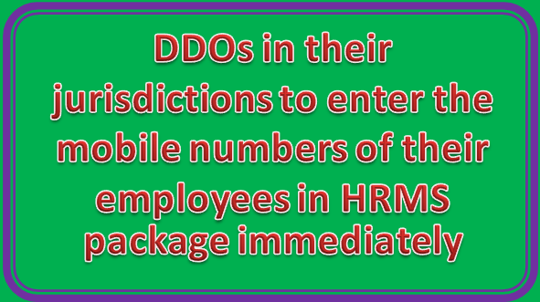 In this connection, Data entry of employee’s mobile number in Employee Updation module of HRMS package is necessary for alerting the employees who due to retire from service within 6 months. All the Treasury Officers in the State arerequested to address the DDOs in their jurisdictions to enter the mobile numbers of their employees In HRMS package immediately.